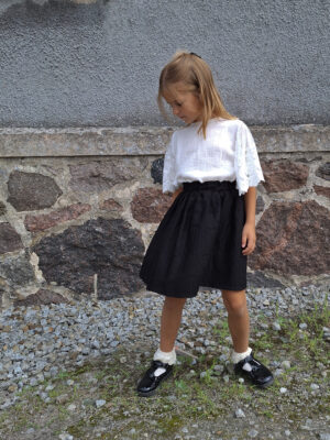 Lniana biała szatka do chrztu ozdobiona bawełnianą koronką.